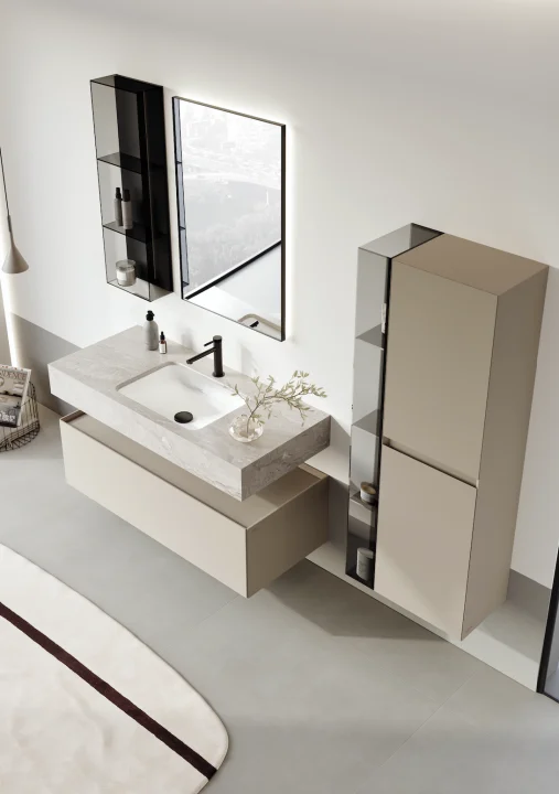 Buğu önleyici özellikli ayna ve on/off kontrol sistemi, günlük kullanımda pratiklik sunuyor. Temperli füme cam raflar ve açık raf modülleri ise depolama alanlarını hem fonksiyonel hem de estetik bir banyo mobilyası çözümüne dönüştürüyor.