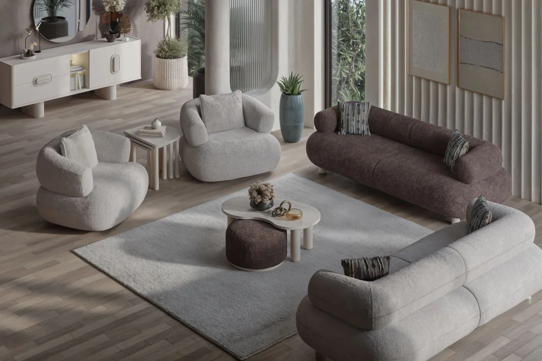 Bir kahve molası, keyifli film akşamı ya da samimi sohbetler için Bolivya Koltuk Takımı mükemmel bir tercih. Ceviz ve vizon bej renklerinin zarif uyumu, antik bronz kulplar ve oval hatlar koleksiyona özgün bir karakter kazandırıyor.