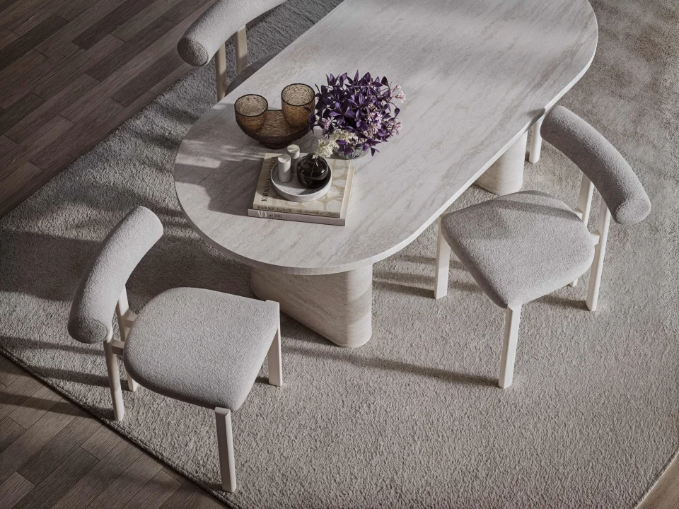 - Traverten taş dokulu masa ayakları, oval başlıklı sandalyeler ve geometrik konsol detayları, sofralarınıza modern bir zarafet kazandırıyor.
