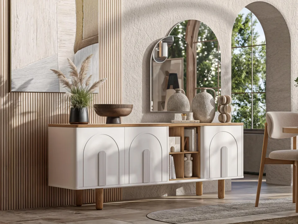 - Frenli menteşeli kapaklar, dayanıklılığı artırırken; ikili ayna detayı, dekorasyona zarif bir dokunuş katıyor.