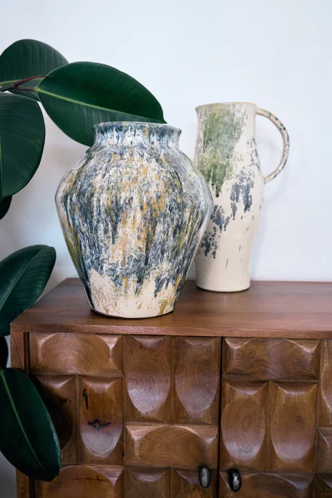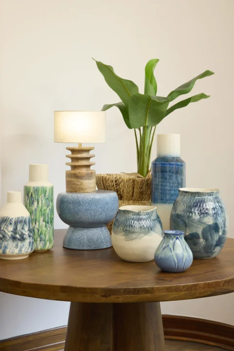 Doğal malzemelerle şekillenen, yumuşak hatlara ve ölçülü renk paletine sahip parçalar; kış aylarının ağırlaşan havasını dengeleyen sakin bir estetik sunuyor. Koleksiyonda yer alan mavi ve beyaz tonlarındaki seramik vazolar, kaseler ve dekoratif objeler; mat ve yarı mat yüzeyleri, el işçiliğini çağrıştıran dokuları ve organik formlarıyla mekânlara güçlü ama sade bir karakter katıyor. Tek başına kullanıldığında dikkat çekici bir vurgu oluşturan bu parçalar, birlikte kullanıldığında ise dengeli ve bütüncül bir atmosfer yaratıyor.